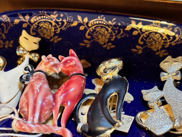 七宝焼、シルバー、鼈甲、ヴィンテージコスチュームジュエリーなど、猫モチーフのブローチや帯留も人気がございます。昭和期の可愛らしいデザインも評価対象です。